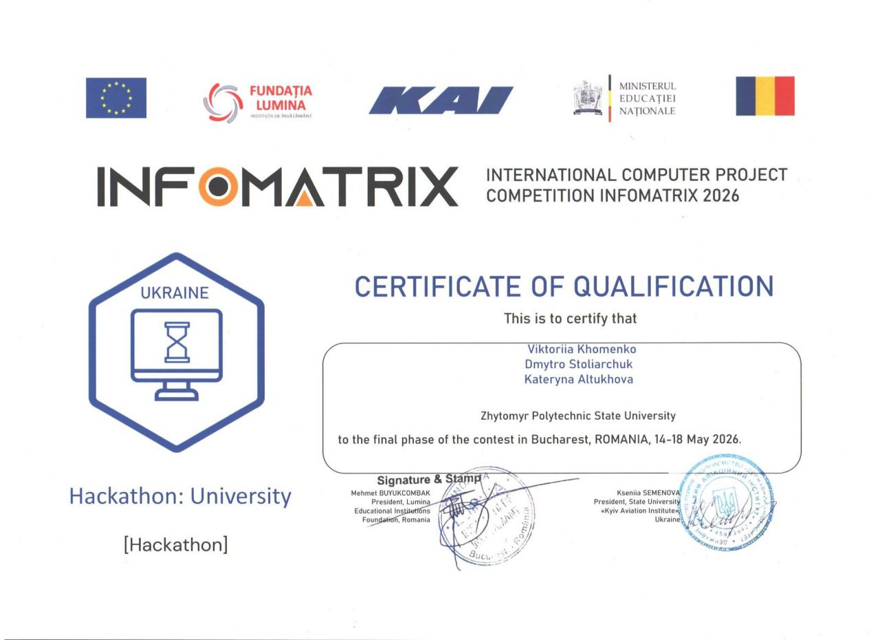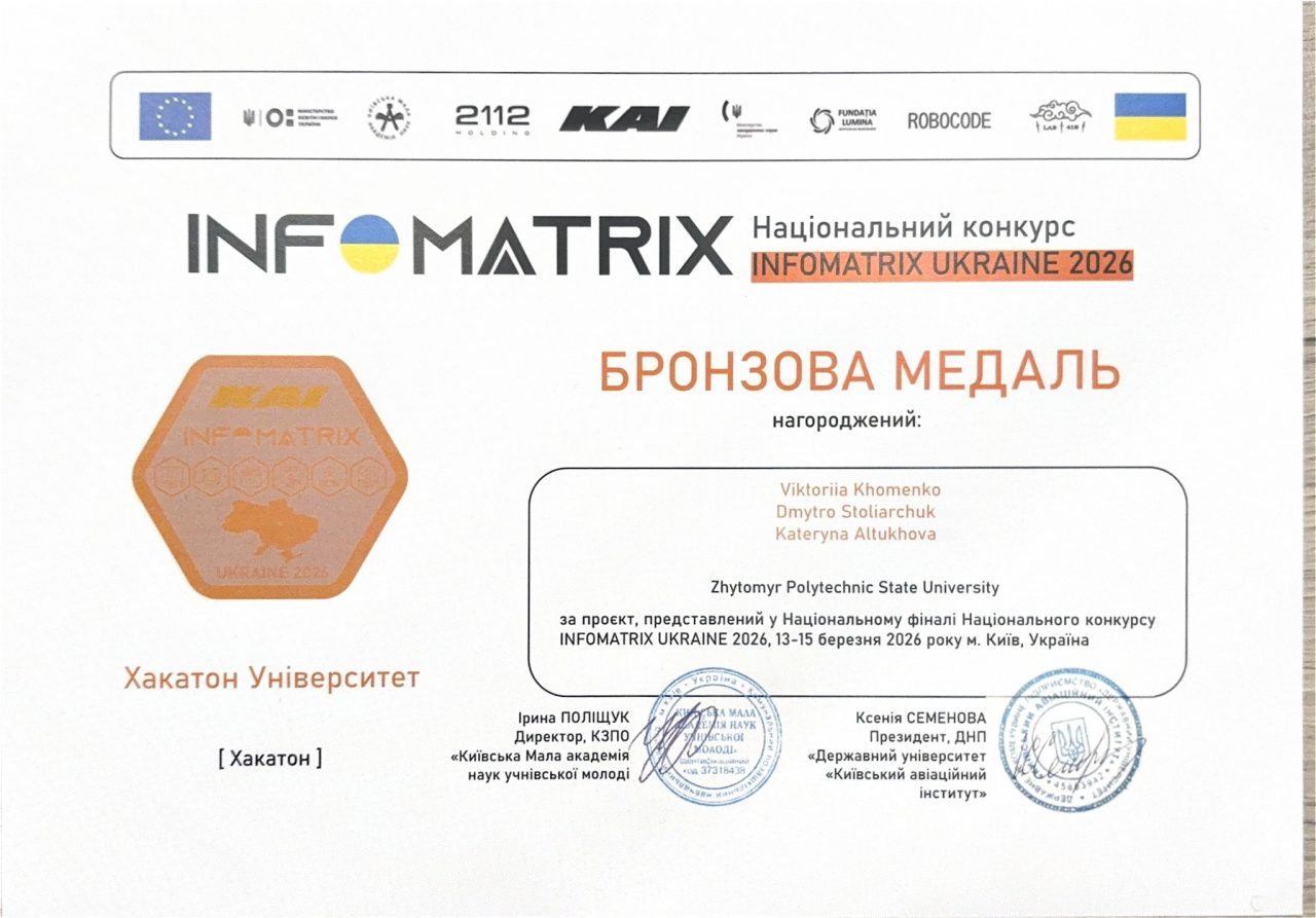 Бронзова медаль студентської команди Житомирської політехніки на Національному конкурсі INFOMATRIX UKRAINE 2026