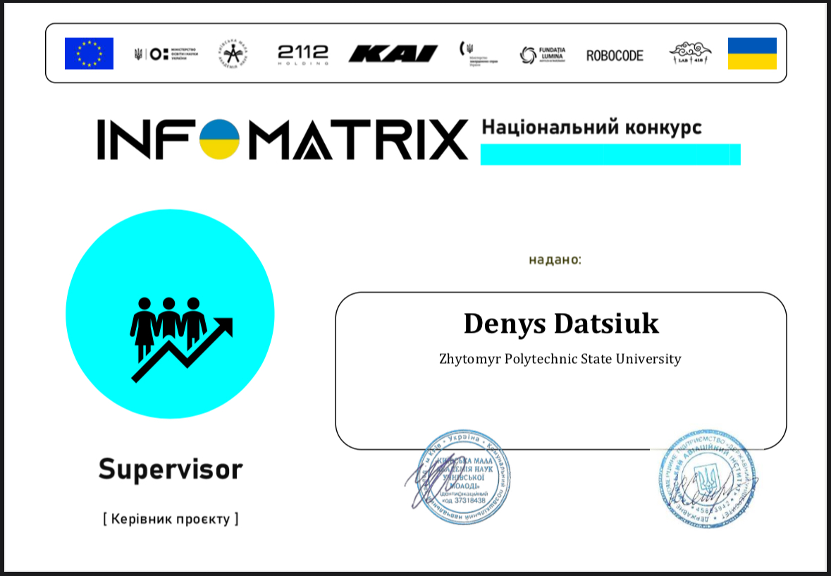 • Керівник проєкту: Денис Дацюк , старший викладач кафедри комп’ютерної інженерії та кібербезпеки.