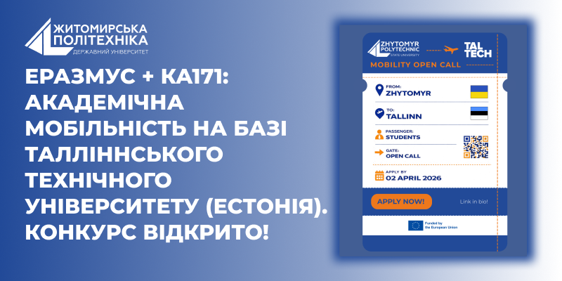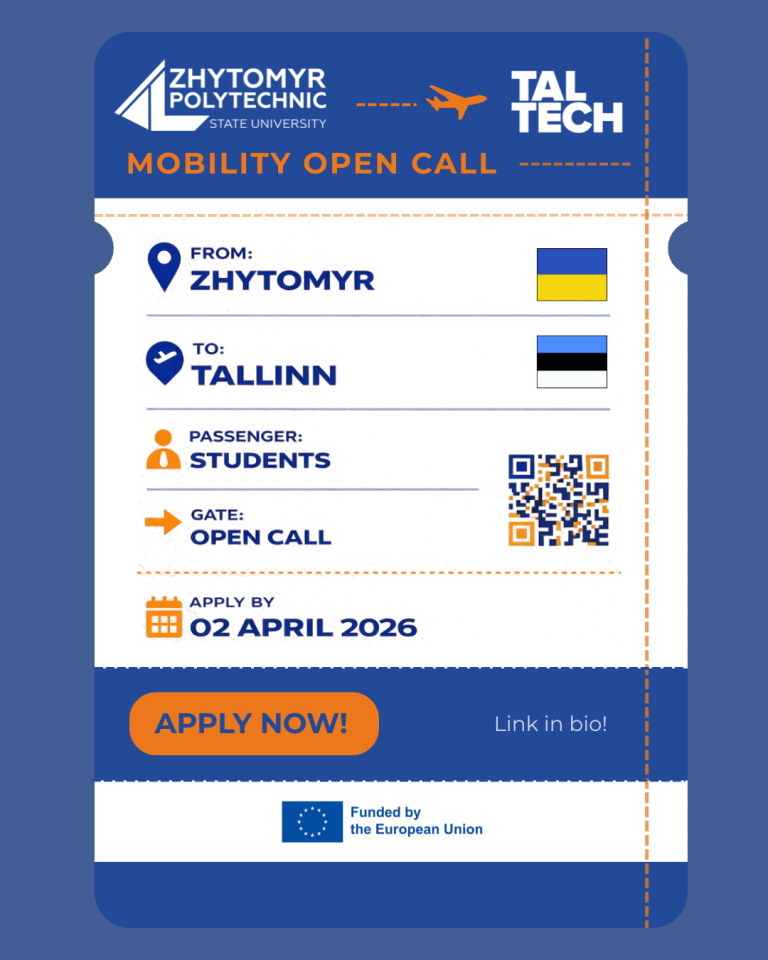 Державний університет «Житомирська політехніка» оголошує відкриття конкурсу на участь у програмі академічної мобільності Erasmus+ (проєкт «Міжнародна кредитна мобільність»).