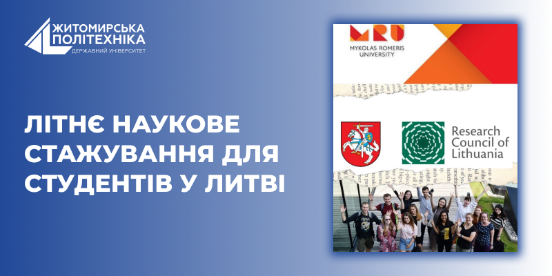 Запрошуємо студентів Державного університету «Житомирська політехніка» взяти участь у літній програмі наукового стажування, що фінансується Радою з досліджень Литви (Research Council of Lithuania, LMT). Програма передбачає виконання індивідуального дослідницького проєкту протягом двох місяців – у липні та серпні – під керівництвом науковців з Університету імені Миколаса Ромеріса (Mykolas Romeris University, Литва).