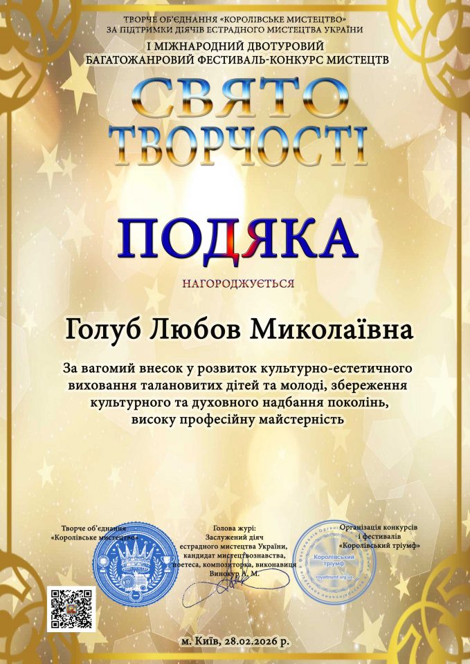 28 лютого 2026 року в місті Києві відбувся І Міжнародний двотуровий багатожанровий фестиваль-конкурс мистецтв «Свято творчості». Організатором мистецької події стало Творче об’єднання «Королівське мистецтво» за підтримки провідних діячів естрадного мистецтва України.
