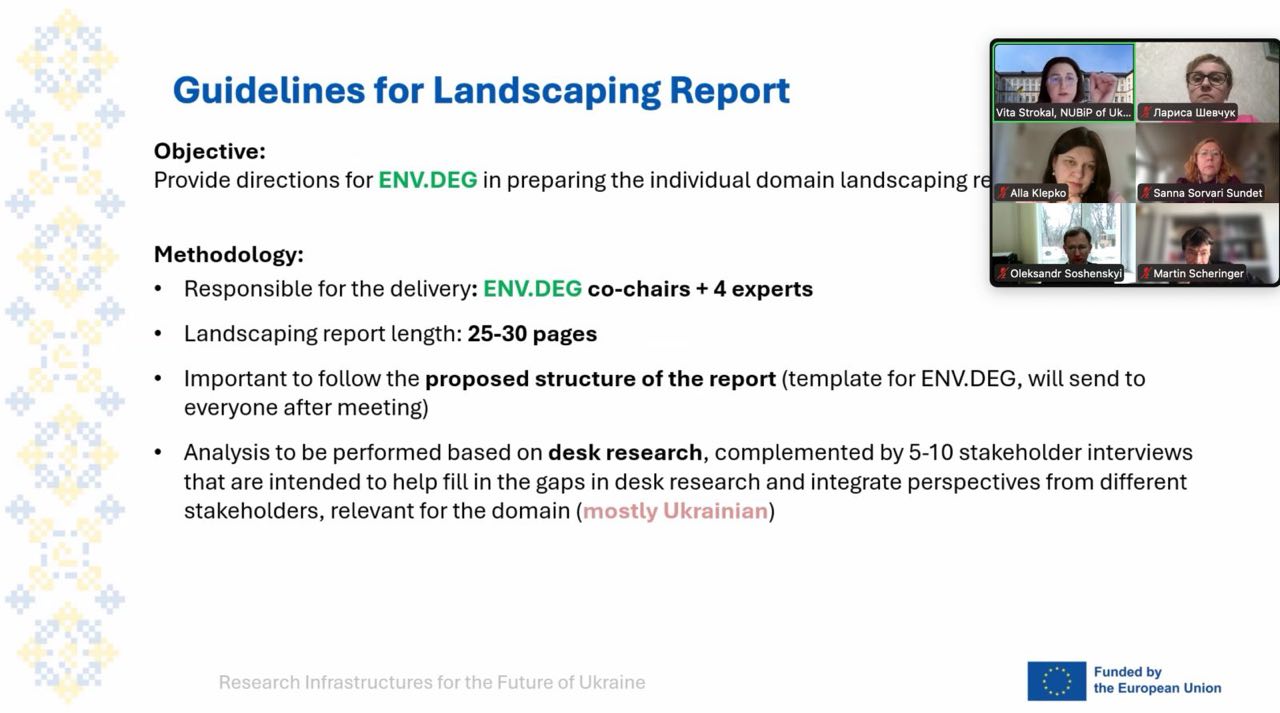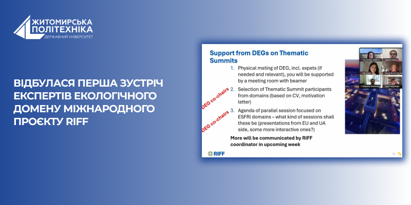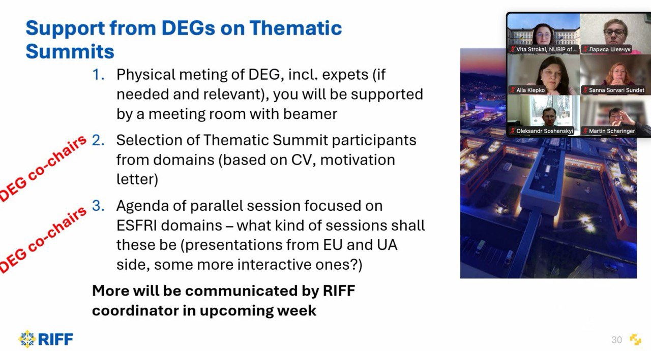 26 лютого 2026 року відбулася загальна зустріч Групи експертів екологічного домену (Environmental Domain Expert Group, ENV.DEG) у рамках міжнародного проєкту RIFF – «Research Infrastructure for the Future of Ukraine» («Дослідницька інфраструктура для майбутнього України»), який фінансується Європейським Союзом.