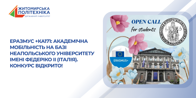 Житомирська політехніка оголошує відкриття конкурсу для здобувачів освіти рівня «Бакалавр» на участь у програмі міжнародної кредитної мобільності Erasmus+. Навчання відбуватиметься на базі Неапольського університету імені Федеріко ІІ (Італія) протягом осіннього семестру 2026/2027 навчального року.
