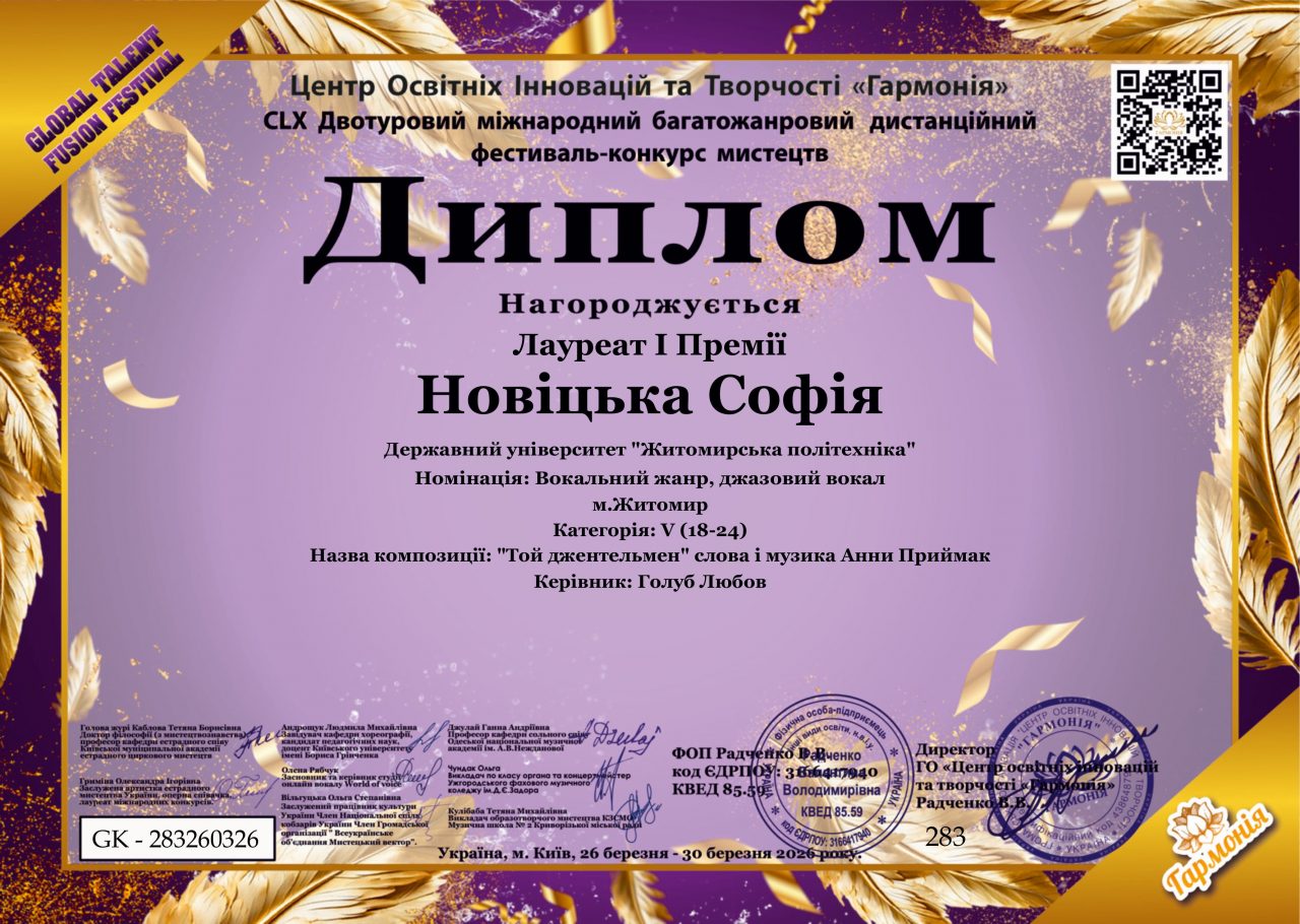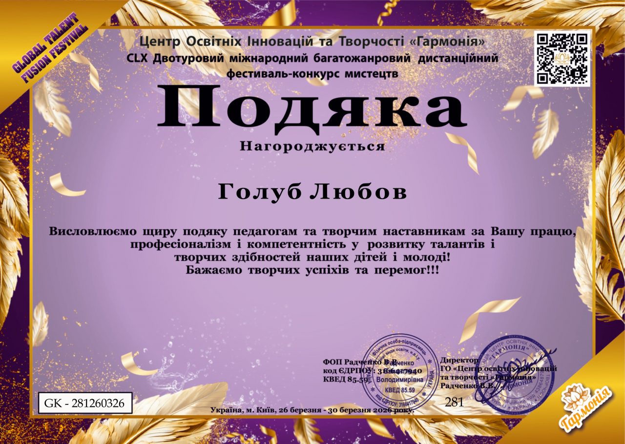 26 березня 2026 року в місті Києві відбувся CLX Міжнародний багатожанровий двотуровий дистанційний фестиваль-конкурс мистецтв «Global Talent Fusion Festival». Організатором заходу виступив Центр освітніх інновацій та творчості «ГАРМОНІЯ». Конкурс проводився з метою розкриття нових талантів, а також презентації творчих досягнень обдарованих дітей і молоді.