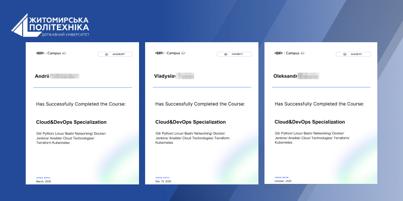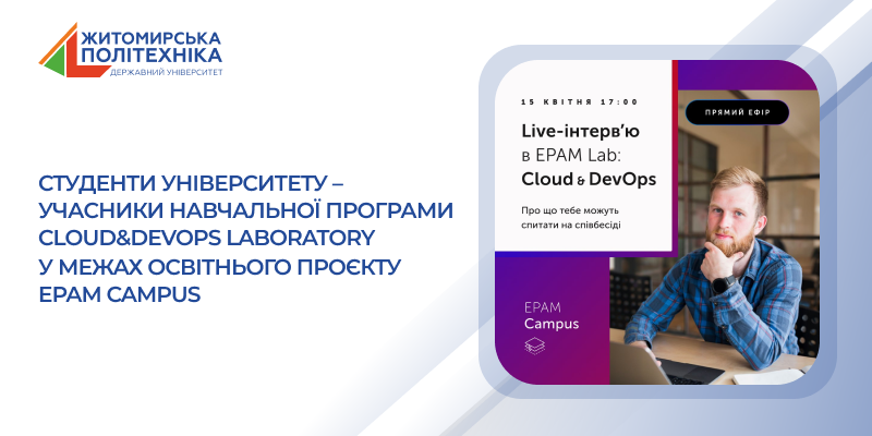 - П’ятеро студентів приєдналися до навчальної програми Cloud&DevOps Laboratory. На сьогодні троє з них вже успішно завершили навчання та офіційно працевлаштовані в компанії EPAM, ще двоє – продовжують підготовку;