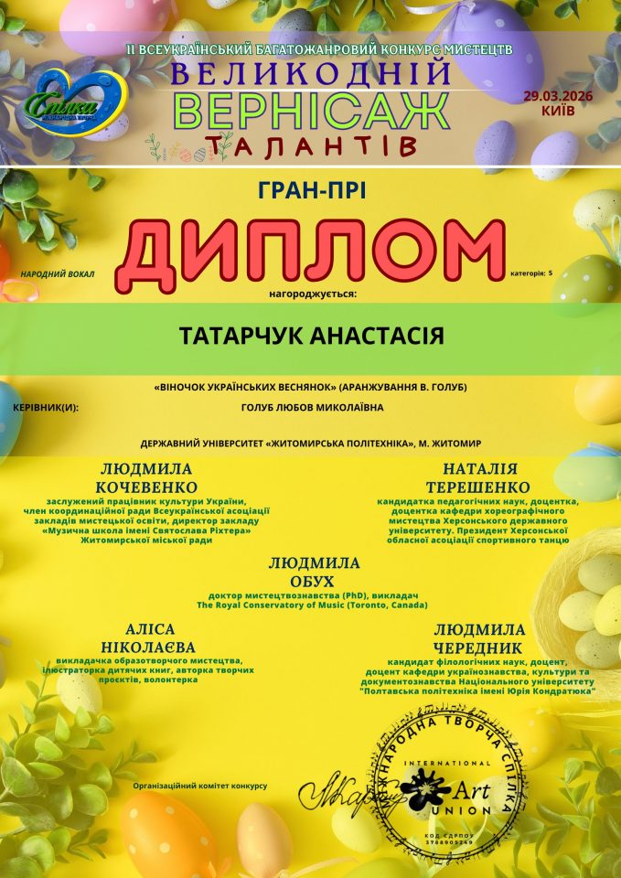 Татарчук Анастасія – Лауреат ГРАН-ПРІ Всеукраїнського конкурсу мистецтв «ВЕЛИКОДНІЙ ВЕРНІСАЖ ТАЛАНТІВ»