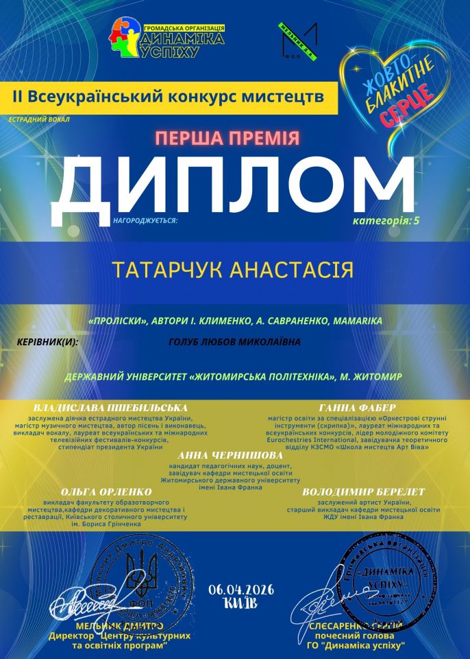 Конкурс відбувся 6 квітня 2026 року в місті Києві за ініціативи громадської організації «Динаміка успіху». Наш університет гідно представила Анастасія Татарчук, студентка факультету бізнесу та сфери обслуговування, спеціальності «Фінанси, банківська справа, страхування та фондовий ринок», учасниця вокального колективу «Акорд» Центру культури студентської молоді (керівник Голуб Л.М.). Вона виконала кавер на пісню MamaRika «Проліски».