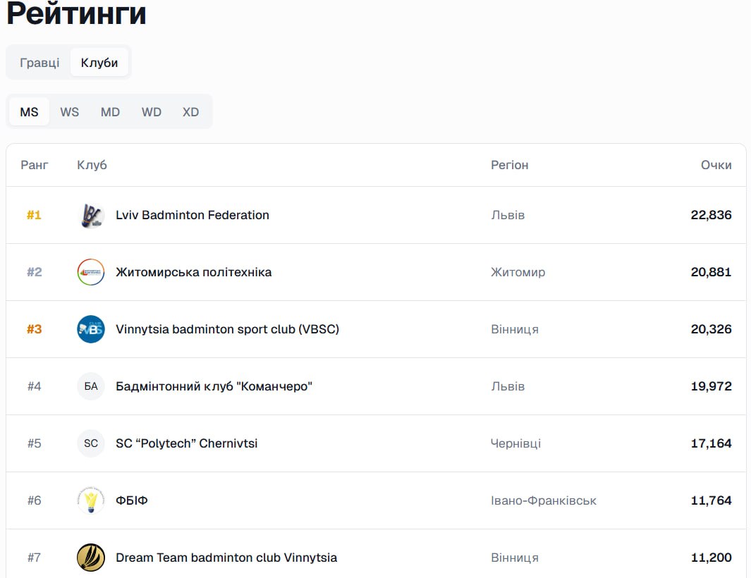 За підсумками декількох турнірів бадмінтонний клуб Житомирської політехніки наразі посідає друге місце в рейтингу клубів.